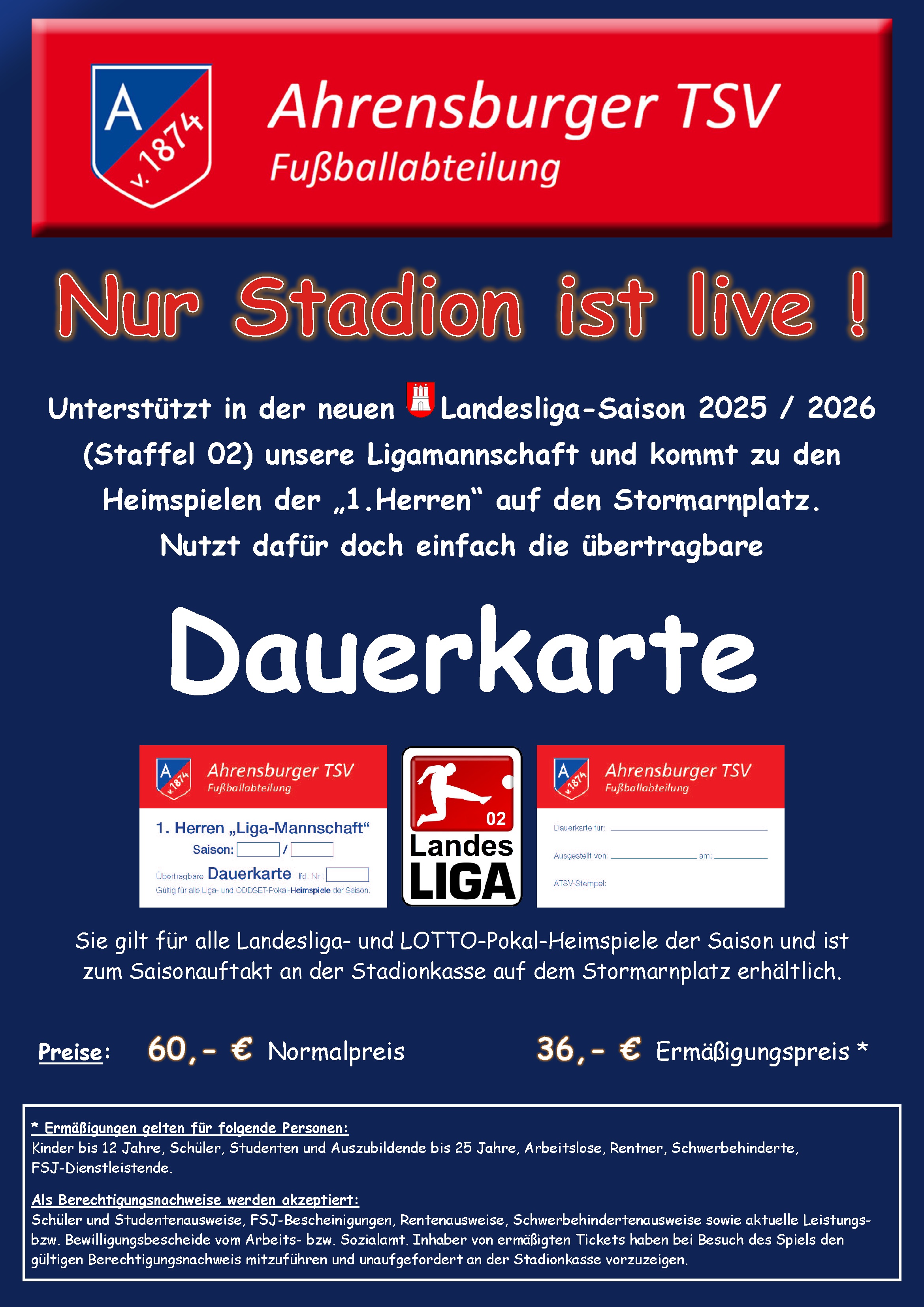 Auch zur Saison 2025/2026 in der Hamburger Landesliga (Staffel 02) sowie im Hamburger LOTTO-Pokal bietet der ATSV wieder eine übertragbare Saison-Dauerkarte für alle Landesliga- und LOTTO-Pokal-Heimspiele der "1. Herren" an. Die Saison-Dauerkarte ist zum Saisonauftakt an der Stadionkasse auf dem Stormarnplatz erhältlich.