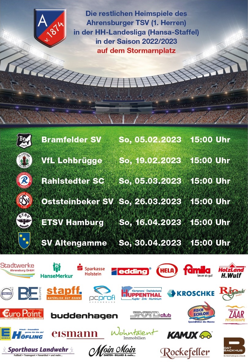 Notiert Euch doch schon mal die Termine zu unseren letzten 6 Heimspielen in der HH-Landesliga-Hansa der lfd. Saison 22/23. Nur der ATSV!